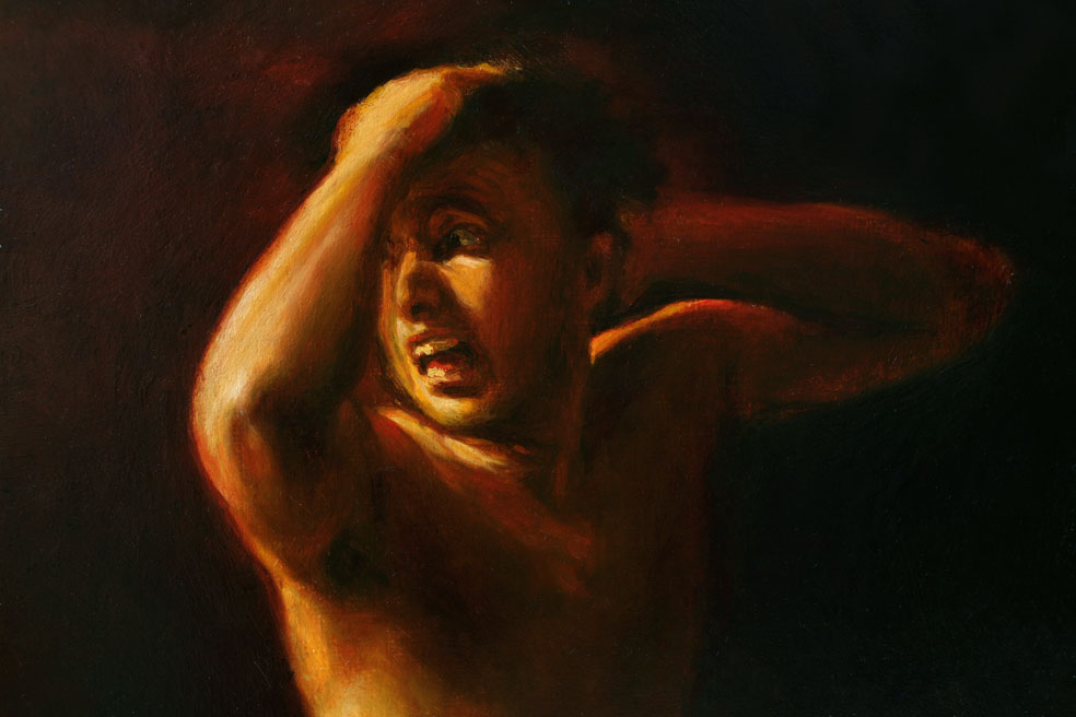 Пятый ангел вострубил, и я увидел звезду, падшую с неба на землю, и дан был ей ключ от кладезя бездны… И из дыма вышла саранча на землю, и дана была ей власть, какую имеют земные скорпионы. (Откровение). В центре полотна Иоанн Богослов. Перед ним открылась завеса будущего, и он с ужасом смотрит в него. Выше – ангелы. Один трубит, другой сам испуган происходящим на его глазах. Третий ангел обращен к зрителю. Одной рукой он пытается закрыть от зрителя сцену апокалипсиса, другой пытается прогнать смотрящего прочь. Этот ангел главный в композиции, ибо не понятны нам слава откровения, не дано и запретно их понимать. В директориях "увеличить" и "скачать" фрагменты картины |