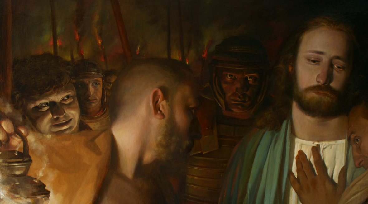 И тотчас, как Он еще говорил, приходит Иуда, один из двенадцати, и с ним множество народа с мечами и кольями, от первосвященников и книжников и старейшин. Предающий же Его дал им знак, сказав: Кого я поцелую, Тот и есть, возьмите Его и ведите осторожно. И, придя, тотчас подошел к Нему и говорит: Равви! Равви! и поцеловал Его. А они возложили на Него руки свои и взяли Его. Один же из стоявших тут извлек меч, ударил раба первосвященникова и отсек ему ухо. Тогда Иисус сказал им: как будто на разбойника вышли вы с мечами и кольями, чтобы взять Меня. Каждый день бывал Я с вами в храме и учил, и вы не брали Меня. Но да сбудутся Писания. Тогда, оставив Его, все бежали. (Марк 14: 43-50) Центральное и все же самое малое место на полотне отведено Иуде, - предателю явному, умом и сердцем предающему Господа на смерть, возложив на Его светлые одежды как на душу, - руку стяжательства, кистень злобы и порока. На переднем плане фигура другого ученика Спасителя. Он убегает прочь, как и прочие бывшие с Господом, предавая страхом и малодушием. Совсем напротив Христа отведено место зрителю. Нам дано не так много времени на раздумье. Римский солдат уже рядом и глядит зрителю прямо в глаза. Остаться, бежать или примкнуть к служителям мамоны? Живот несчастного Малха, в огне факелов и светильников, - вот олицетворение того что пришли защищать книжники и фарисеи, что так ревностно ищем и защищаем мы по сей день. Справа – Петр. Он достает из ножен меч и полон решимости защищать учителя. Так бывает, когда движимые горячением крови видим в сиюминутном порыве самоотверженности и отваги силу духа, но вот уже остыли, и от решимости прежней не остается следа. Совсем скоро Петр предаст Христа и будет каяться в этом всю жизнь. Раскается и Иуда. За что же мы поносим Иуду и прославляем Петра? Нет грехов не прощаемых. Мы же виним христопродавца за то что и сами совершаем ежеминутно. Грех Иуды в том, что он, в отличии от Петра, не смог смирится с осознанием собственного ничтожества: «Разве я, Иуда, могу быть яко червь?» Гордыня – грех его. Умолкнет же осуждающий, но готовый скорей умереть, чем признать: «Я – червь, а не человек» (Пс. 21,7). В категориях "скачать" и "увеличить" фрагменты картины |
