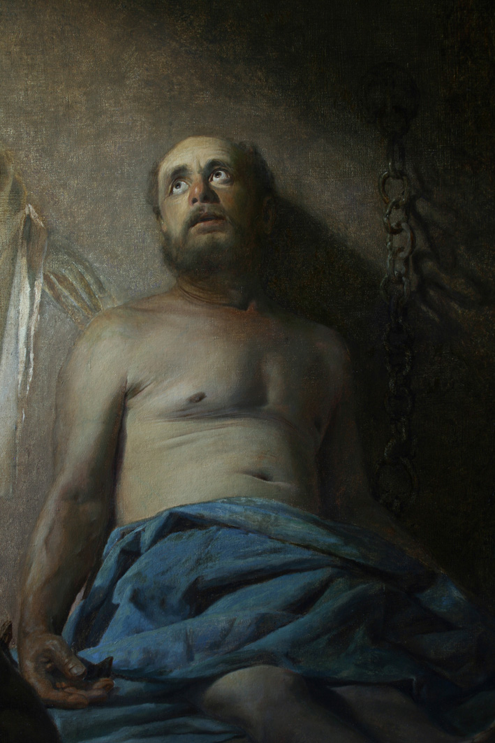 В то время царь Ирод поднял руки на некоторых из принадлежащих к церкви, чтобы сделать им зло, и убил Иакова, брата Иоаннова, мечом. Видя же, что это приятно Иудеям, вслед за тем взял и Петра, — тогда были дни опресноков, - и, задержав его, посадил в темницу, и приказал четырем четверицам воинов стеречь его, намереваясь после Пасхи вывести его к народу. Итак Петра стерегли в темнице, между тем церковь прилежно молилась о нем Богу. Когда же Ирод хотел вывести его, в ту ночь Петр спал между двумя воинами, скованный двумя цепями, и стражи у дверей стерегли темницу. И вот, Ангел Господень предстал, и свет осиял темницу. Ангел, толкнув Петра в бок, пробудил его и сказал: встань скорее. И цепи упали с рук его. И сказал ему Ангел: опояшься и обуйся. Он сделал так. Потом говорит ему: надень одежду твою и иди за мною. Петр вышел и следовал за ним, не зная, что делаемое Ангелом было действительно, а думая, что видит видение. Пройдя первую и вторую стражу, они пришли к железным воротам, ведущим в город, которые сами собою отворились им: они вышли, и прошли одну улицу, и вдруг Ангела не стало с ним. Тогда Петр, придя в себя, сказал: теперь я вижу воистину, что Господь послал Ангела Своего и избавил меня из руки Ирода и от всего, чего ждал народ Иудейский (Деян. 12:1-11). Фрагменты в дирректориях "Скачать" и "увеличить". Фрагмент ангела здесь: http://artnow.ru/ru/gallery/3/4261/picture/0/250790.html |