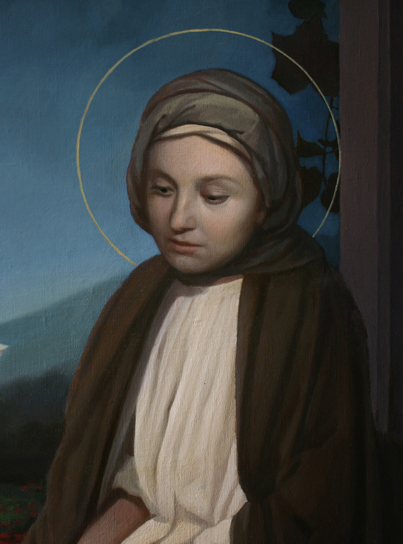 Иисус, увидев Матерь и ученика тут стоящего, которого любил, говорит Матери Своей: Жено! се, сын Твой. Потом говорит ученику: се, Матерь твоя! (Иоанн 19:26-27). Произнеся те слова на кресте, Господь усыновил человечество Матери Своей Пресвятой Богородице. Голубые одежды Девы имеют цвет неба за окном. Земля служит подножием ног Ее. Небо - престолом Сына. Словно книга на аналое Бог Слово на коленях Ее. От Духа Святого зачатый во чреве Господь оберегаем руками Матери Своей и божьим повелением. За окном образ мира, суетного, грозового и голгофского. Виноградная лоза – олицетворяет крестную жертву, поле красных роз – мирскую радость и страсть презревшую праведность. Завеса отделяет зримое от незримого. Лилия - символ непорочности. Семь цветов той лилии – семь радостей Девы Марии. Восьмой нераспустившийся цвет – восьмая радость и тайна будущего века. То день восьмой от сотворения мира, когда Сын Её претерпя уничижение и смерть на Земле придет во Славе, и «будет Бог все во всем» (Коринф 15:28). Радуйся Невеста неневестная! Радуйся Заступница усердная, рода христианского! В дирректориях "увеличенный рисунок", "файлы для скачивания" фрагменты картины |