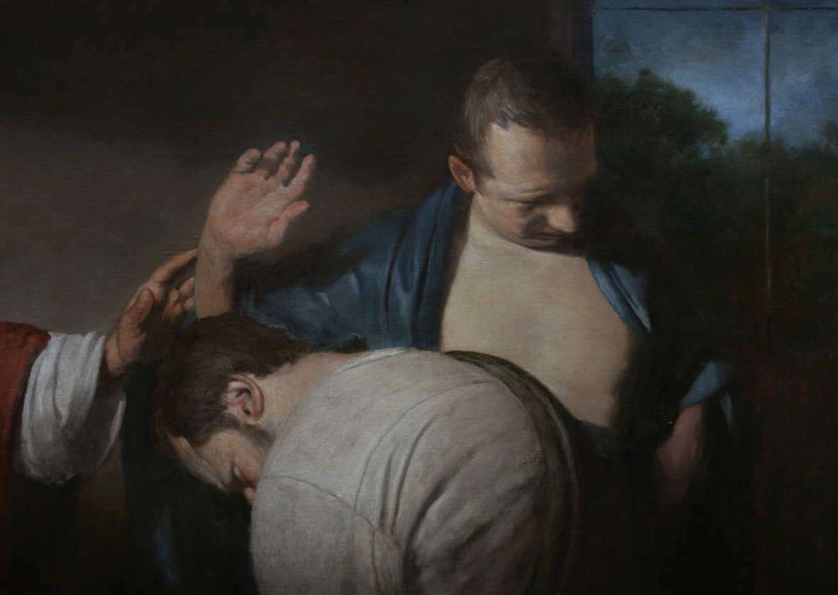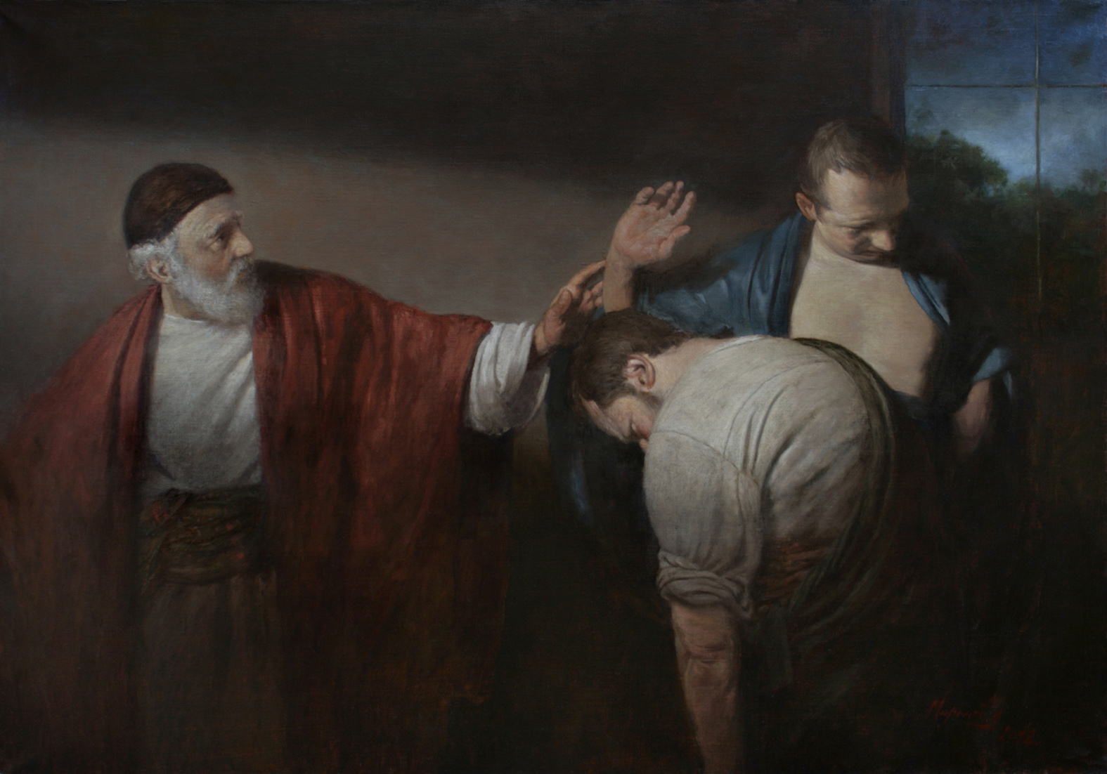 У одного человека было два сына; и он, подойдя к первому, сказал: сын! пойди сегодня работай в винограднике моем. Но он сказал в ответ: не хочу; а после, раскаявшись, пошел. И подойдя к другому, он сказал то же. Этот сказал в ответ: иду, государь, и не пошел. Который из двух исполнил волю отца? Говорят Ему: первый. Иисус говорит им: истинно говорю вам, что мытари и блудницы вперед вас идут в Царство Божие, ибо пришел к вам Иоанн путем праведности, и вы не поверили ему, а мытари и блудницы поверили ему; вы же, и видев это, не раскаялись после, чтобы поверить ему (Мф. 21:28-32). Слева, отец протянул руку свою для вразумления строптивого сына и той же рукой осеняет отеческой десницей второго сына, припавшего под благословение. Первый сын изображен на фоне виноградника за окном, - символа Царства Небесного. |