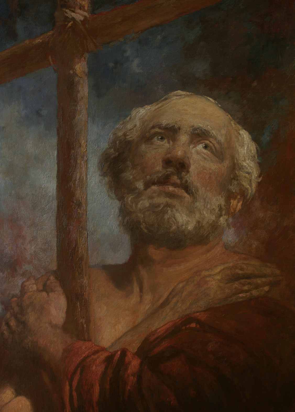 Святой Андрей взирает на Голгофу приняв от неё духовный крест нести проповедь Христа миру. Сложенные на груди и сжимающие крест руки знаменуют будущую казнь апостола. Собственным крестом он засвидетельствовал крест Господень, своей мученической смертью зажег огонь в сердцах других людей и поколений. |
