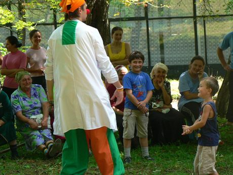 Когда я выхожу на улицу, тамошние психологи смотрят на меня скептически, а зрители собираются буквально за 2 минуты со своими скамейками и обставляют для меня большой пятачок для работы. Здесь около 150 человек – 30-40 детей и столько же взрослых подростков, много осетинских бабушек. Мы знакомимся, играем в части лица, общаемся. Видно, что это люди из окраин Цхинвала и соседних сел - бабушки очень смутно понимают русский язык. Меня спасает мальчик лет 6,7 – Сармат, он активно участвует в фокусах, исполняет даже сольный осетинский танец, и вообще ведет себя очень активно и добродушно. Публика постепенно начинает понимать язык клоунады и действо разворачивается на полную катушку. Тянем канат, прыгаем через него и под ним. Фокусы и шары приводят всех в восторг, становится даже как-то приятно.