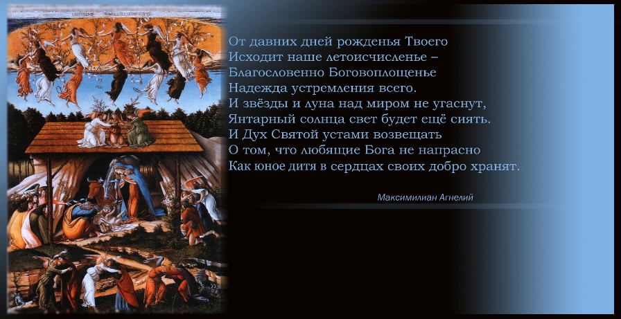 От давних дней рожденья Твоего Исходит наше летоисчисленье – Благословенно Боговоплощенье Надежда устремленья всего. И звёзды и луна над миром не угаснут, Янтарный солнца свет, будет ещё сиять. И Дух Святой устами возвещать О том, что любящие Бога не напрасно Как юное дитя в сердцах своих добро хранят. |