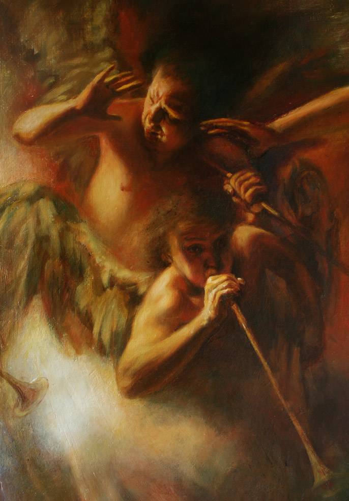 Пятый ангел вострубил, и я увидел звезду, падшую с неба на землю, и дан был ей ключ от кладезя бездны… И из дыма вышла саранча на землю, и дана была ей власть, какую имеют земные скорпионы. (Откровение). В центре полотна Иоанн Богослов. Перед ним открылась завеса будущего, и он с ужасом смотрит в него. Выше – ангелы. Один трубит, другой сам испуган происходящим на его глазах. Третий ангел обращен к зрителю. Одной рукой он пытается закрыть от зрителя сцену апокалипсиса, другой пытается прогнать смотрящего прочь. Этот ангел главный в композиции, ибо не понятны нам слава откровения, не дано и запретно их понимать. В директориях "увеличить" и "скачать" фрагменты картины |