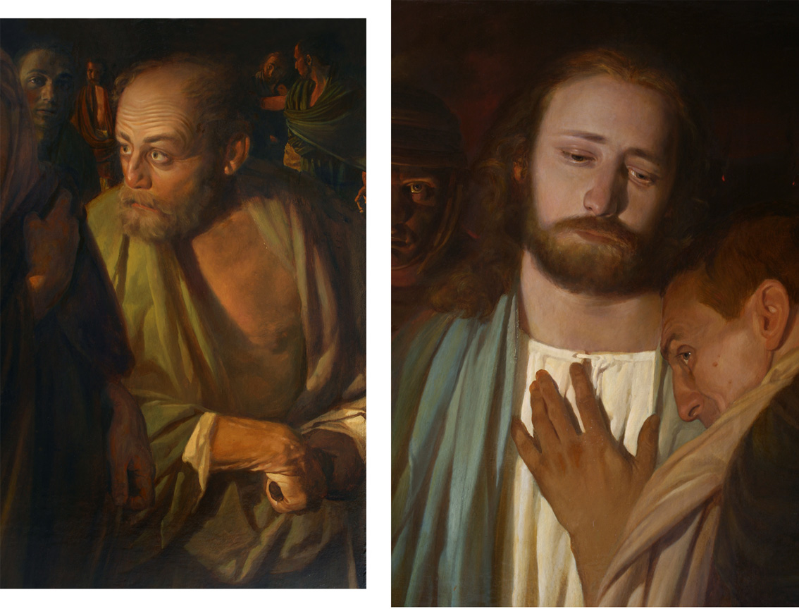 И тотчас, как Он еще говорил, приходит Иуда, один из двенадцати, и с ним множество народа с мечами и кольями, от первосвященников и книжников и старейшин. Предающий же Его дал им знак, сказав: Кого я поцелую, Тот и есть, возьмите Его и ведите осторожно. И, придя, тотчас подошел к Нему и говорит: Равви! Равви! и поцеловал Его. А они возложили на Него руки свои и взяли Его. Один же из стоявших тут извлек меч, ударил раба первосвященникова и отсек ему ухо. Тогда Иисус сказал им: как будто на разбойника вышли вы с мечами и кольями, чтобы взять Меня. Каждый день бывал Я с вами в храме и учил, и вы не брали Меня. Но да сбудутся Писания. Тогда, оставив Его, все бежали. (Марк 14: 43-50) Центральное и все же самое малое место на полотне отведено Иуде, - предателю явному, умом и сердцем предающему Господа на смерть, возложив на Его светлые одежды как на душу, - руку стяжательства, кистень злобы и порока. На переднем плане фигура другого ученика Спасителя. Он убегает прочь, как и прочие бывшие с Господом, предавая страхом и малодушием. Совсем напротив Христа отведено место зрителю. Нам дано не так много времени на раздумье. Римский солдат уже рядом и глядит зрителю прямо в глаза. Остаться, бежать или примкнуть к служителям мамоны? Живот несчастного Малха, в огне факелов и светильников, - вот олицетворение того что пришли защищать книжники и фарисеи, что так ревностно ищем и защищаем мы по сей день. Справа – Петр. Он достает из ножен меч и полон решимости защищать учителя. Так бывает, когда движимые горячением крови видим в сиюминутном порыве самоотверженности и отваги силу духа, но вот уже остыли, и от решимости прежней не остается следа. Совсем скоро Петр предаст Христа и будет каяться в этом всю жизнь. Раскается и Иуда. За что же мы поносим Иуду и прославляем Петра? Нет грехов не прощаемых. Мы же виним христопродавца за то что и сами совершаем ежеминутно. Грех Иуды в том, что он, в отличии от Петра, не смог смирится с осознанием собственного ничтожества: «Разве я, Иуда, могу быть яко червь?» Гордыня – грех его. Умолкнет же осуждающий, но готовый скорей умереть, чем признать: «Я – червь, а не человек» (Пс. 21,7). В категориях "скачать" и "увеличить" фрагменты картины |