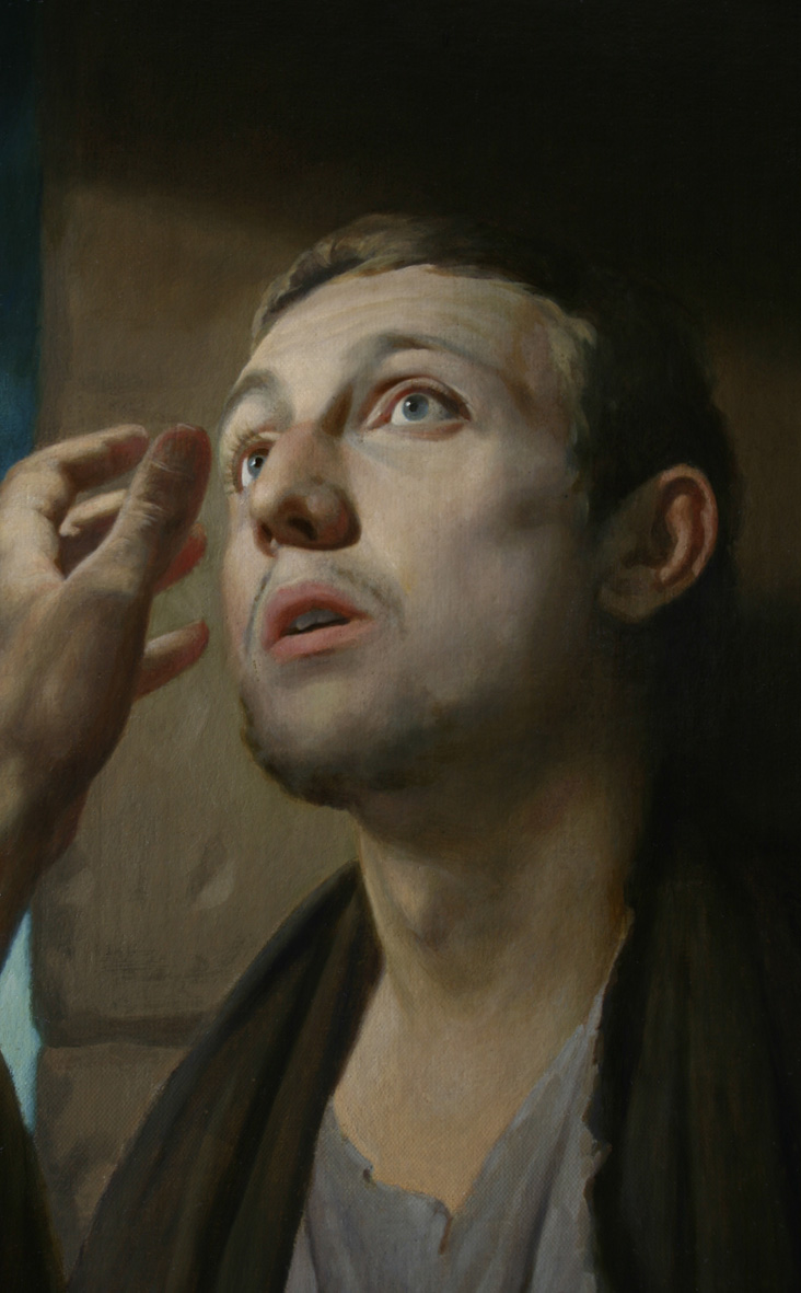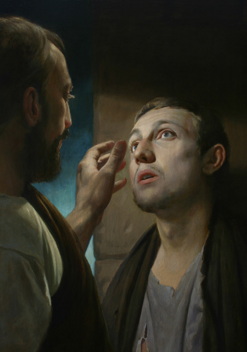 Приходят в Иерихон. И когда выходил Он из Иерихона с учениками Своими и множеством народа, Вартимей, сын Тимеев, слепой сидел у дороги, прося милостыни. Услышав, что это Иисус Назорей, он начал кричать и говорить: Иисус, Сын Давидов! помилуй меня. Многие заставляли его молчать; но он еще более стал кричать: Сын Давидов! помилуй меня. Иисус остановился и велел его позвать. Зовут слепого и говорят ему: не бойся, вставай, зовет тебя. (Марк. 10:46-49) И, проходя, увидел человека, слепого от рождения. Ученики Его спросили у Него: Равви! кто согрешил, он или родители его, что родился слепым? Иисус отвечал: не согрешил ни он, ни родители его, но это для того, чтобы на нем явились дела Божии. Мне должно делать дела Пославшего Меня, доколе есть день; приходит ночь, когда никто не может делать. Доколе Я в мире, Я свет миру. Сказав это, Он плюнул на землю, сделал брение из плюновения и помазал брением глаза слепому… (Иоанн. 9:1-6) Иисус, остановившись, велел привести его к Себе: и, когда тот подошел к Нему, спросил его: чего ты хочешь от Меня? Он сказал: Господи! чтобы мне прозреть. Иисус сказал ему: прозри! вера твоя спасла тебя. И он тотчас прозрел и пошел за Ним, славя Бога; и весь народ, видя это, воздал хвалу Богу. (Луки. 18:40-43) Рука нищего, протянутая за милостыней символизирует руку просящего о милостыни духовной. Этот человек есть образ нищего духом. Правая рука Христа держащая брение из земли символизирует руку дающего. Я свет миру (Иоанн 8:12). Впрочем, свет оживляющий лицо слепорожденного, и наполняющий его красками, - есть свет тварный, ибо Свет Истины уже узрел просящий прежде своего исцеления. Нищий - есть образ человека Нового Завета. В то время когда знавшие закон не увидели Истину, не знавшие закон язычники приняли Христа. Таким же слепым от рождения но прозревшим был не «эллин не иудей», но народ христианский. Блаженны нищие духом, ибо их есть Царство Небесное (Матф. 5:3). Блаженны чистые сердцем, ибо они Бога узрят (Матф. 5:8) В дирректориях "файл для скачивания" и "увеличенный рисунок" фрагменты картины |