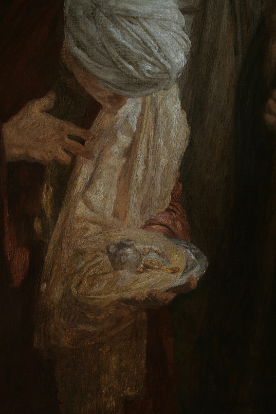 Увидев же звезду, они возрадовались радостью весьма великою, и, войдя в дом, увидели Младенца с Мариею, Матерью Его, и, пав, поклонились Ему; и, открыв сокровища свои, принесли Ему дары: золото, ладан и смирну (Мф. 2:10-11). Склонившийся над Младенцем в поклоне символизирует приношение царское, ибо Господь есть Царь. Возведший взор свой к небу – символизирует ладан, ибо Бог. Немощный старик – смирну, ибо Господь пришел в мир человеком, и был убит. |
