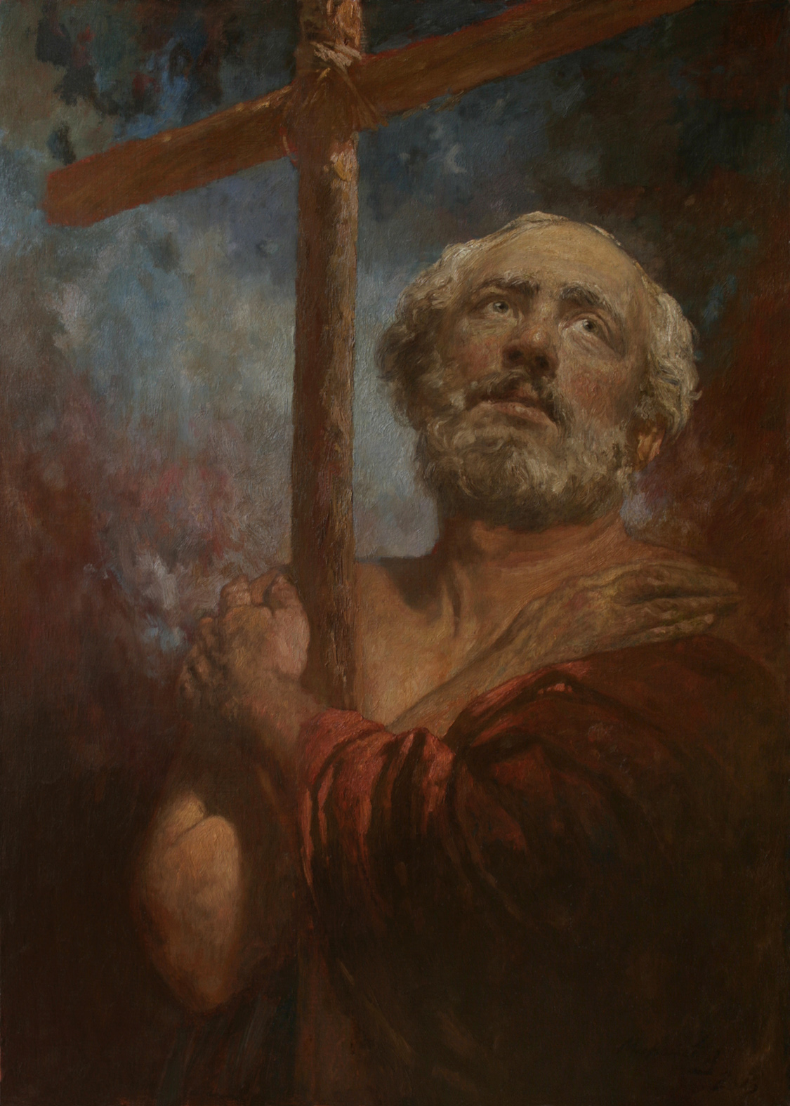 Святой Андрей взирает на Голгофу приняв от неё духовный крест нести проповедь Христа миру. Сложенные на груди и сжимающие крест руки знаменуют будущую казнь апостола. Собственным крестом он засвидетельствовал крест Господень, своей мученической смертью зажег огонь в сердцах других людей и поколений. |